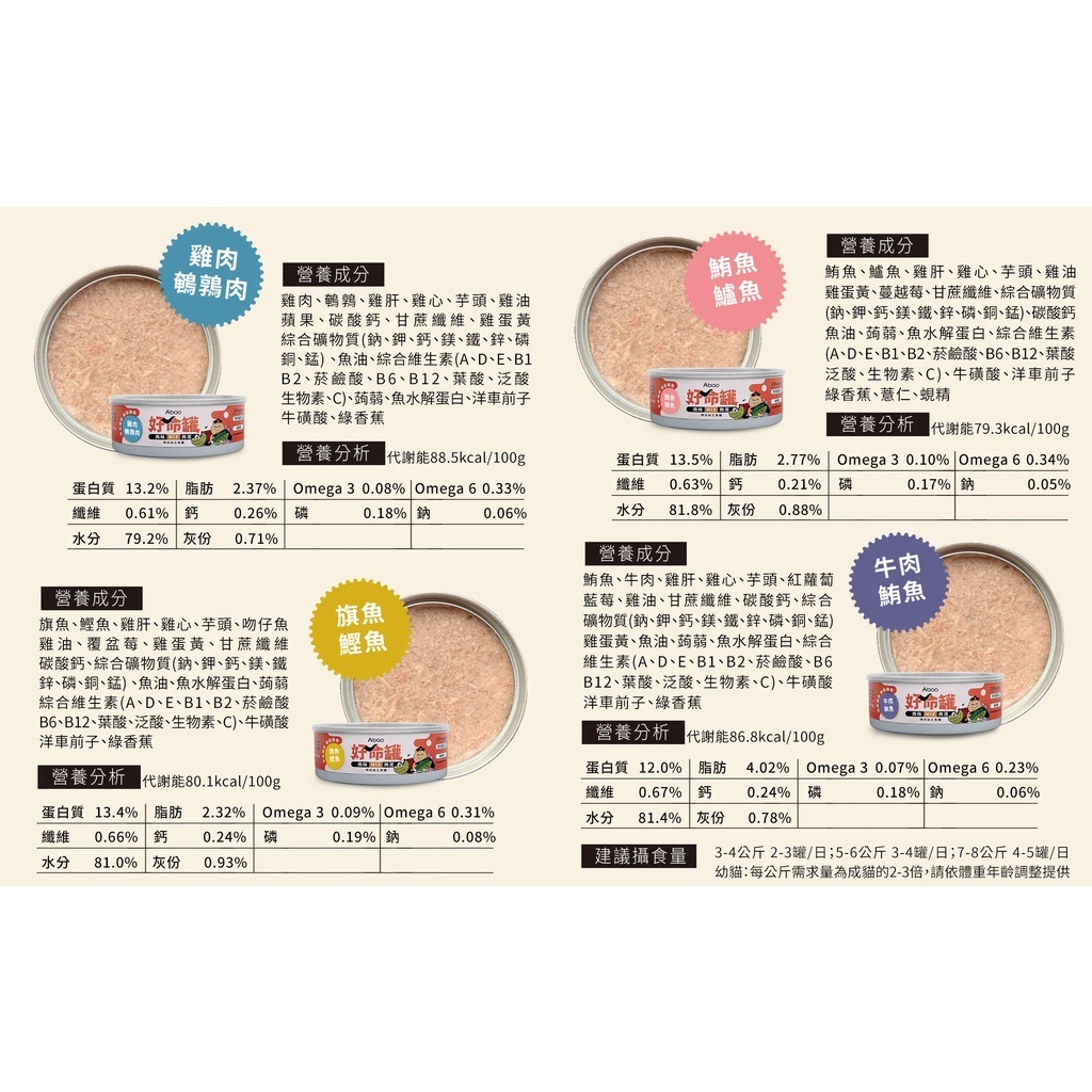 品牌:Abao 阿寶商品:好命罐 微肉絲貓咪主食罐容量:80g產品特色:🔸全新肉絲與肉泥的碰撞🔸搭配100%純雞高湯🔸挑戰最高適口性🔸濃郁肉香!額外加水也能享受濃郁肉湯饗宴!🔸在地生產!無穀🔸適用全年齡貓產品口味:牛肉 x 鮪魚,旗魚 x 鰹魚,鮪魚 x 鱸魚,雞肉 x 鵪鶉肉