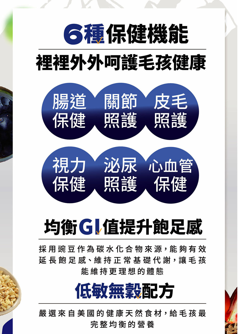 高蛋白+低碳水配方,忠於貓咪原始的食肉生態。含有來自藍莓和蔓越莓的天然抗氧化劑以及易吸收的敖合礦物質,符合全年齡的貓咪食用的營養水準
