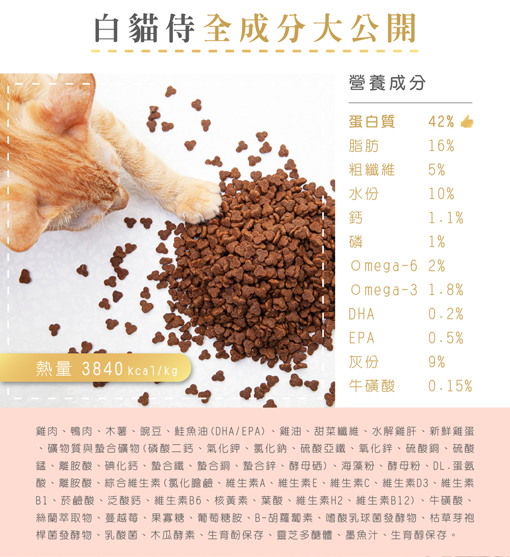 蛋白質42%、脂肪16%、纖維5%、水分10%、鈣1.1%、磷1%、Omega-6 2%、Omega-3 1.8%、DHA/EPA: 0.2%/0.5%、灰份9%、牛磺酸0.15%