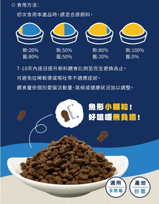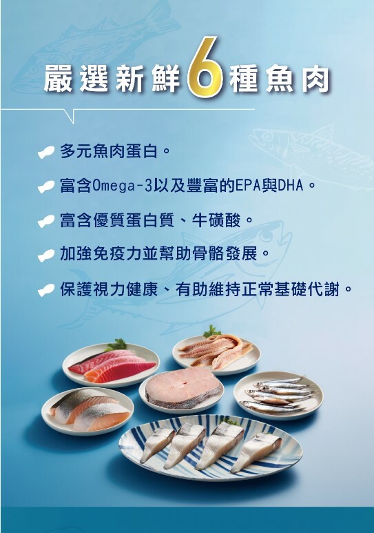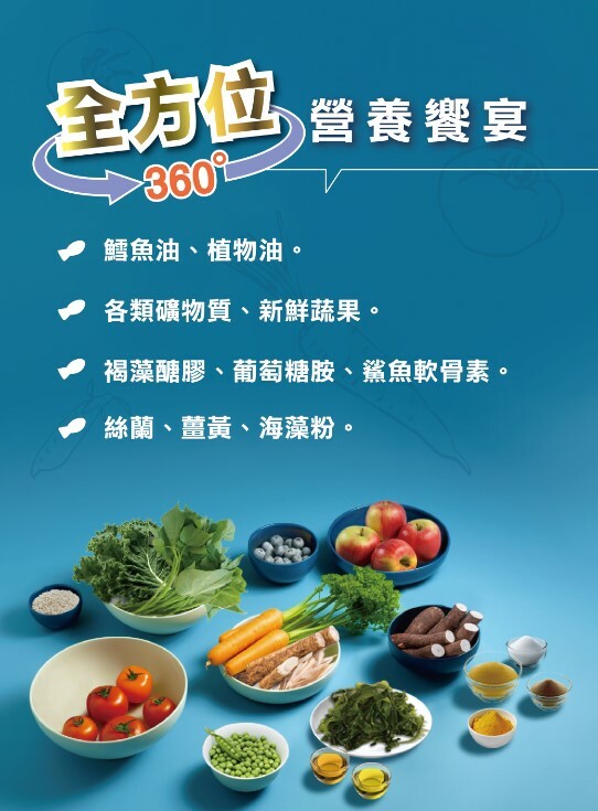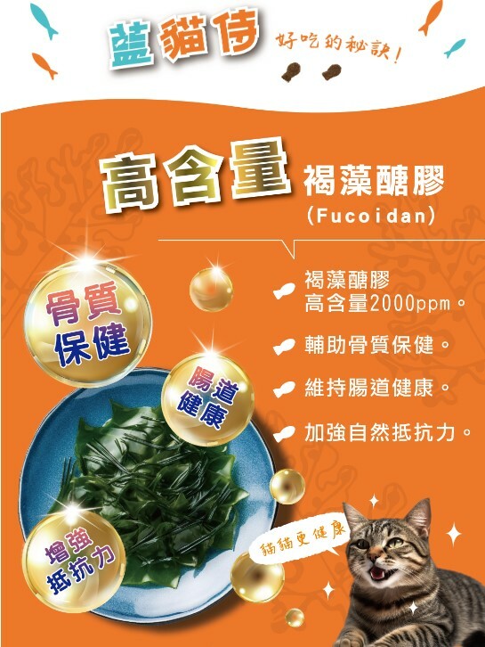 蛋白質40%、脂肪16%、粗纖維3%、灰份9%、水分8%、鈣1.1%、磷1%、Omega-3 1.8%、Omega-6 2%、牛磺酸0.15%、專利二代小分子褐藻醣膠2000ppm