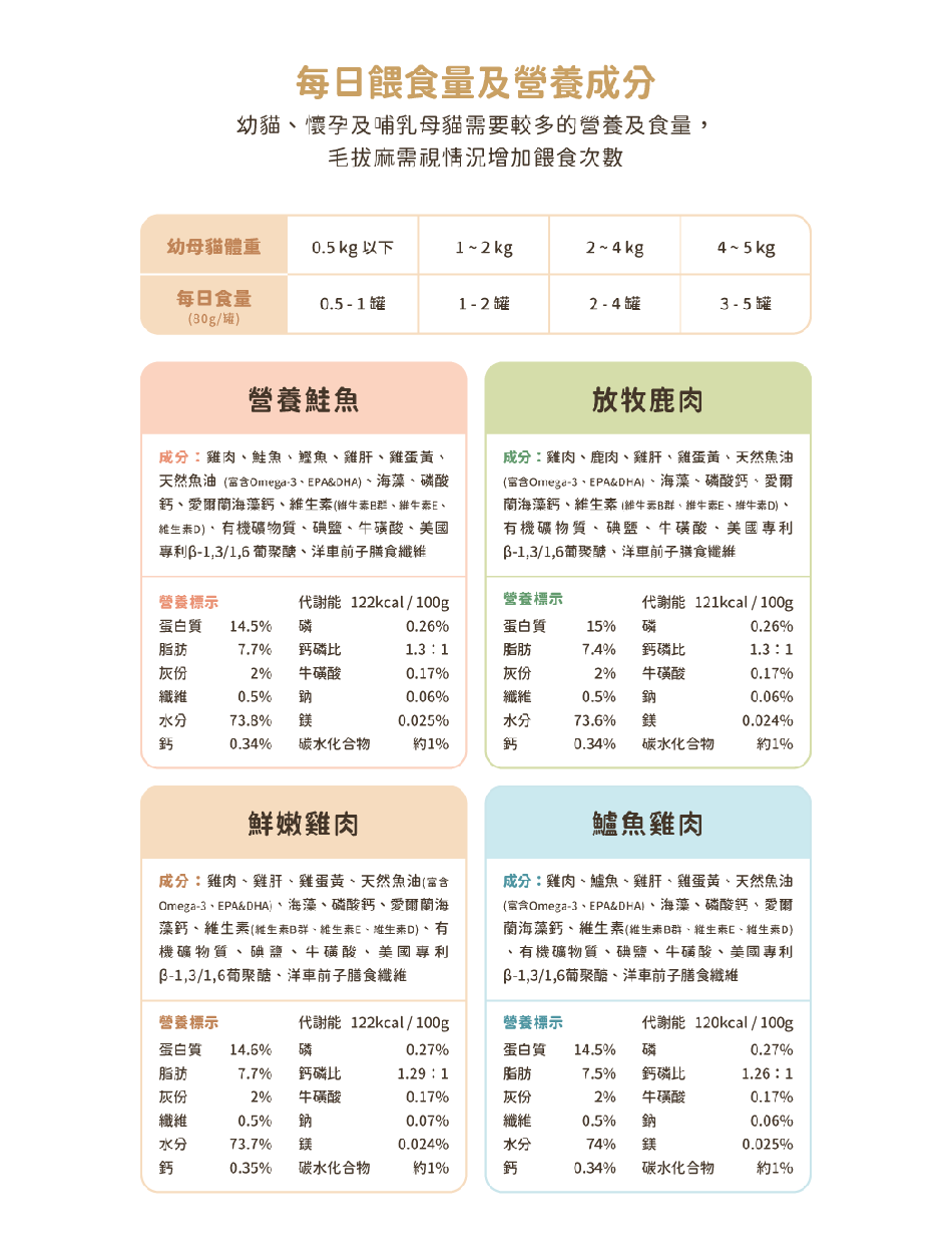 幕斯質地易於舔食,幼貓可輕鬆進食、消化吸收;幫助懷孕哺乳期母貓營養補充。