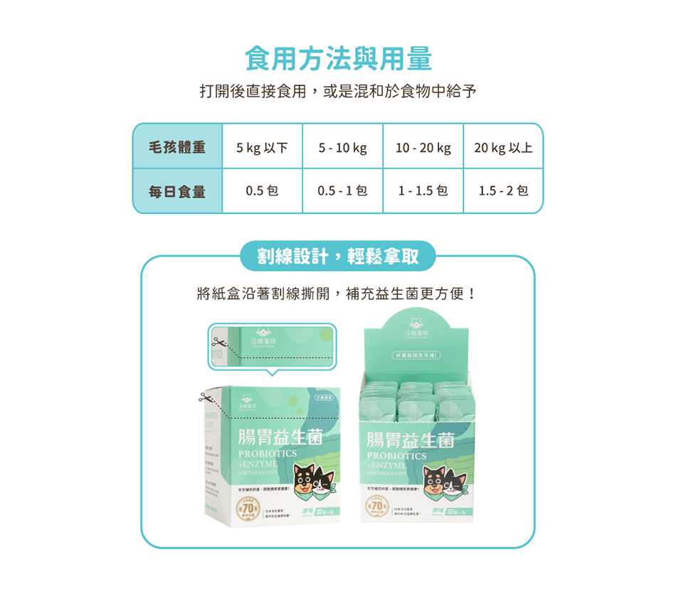 成份:冷凍乾燥雞胸肉及雞肝、比菲德氏龍根菌BB536、比菲德氏短雙歧桿菌M-16V、嗜酸乳桿菌NCFM、乳酸雙歧桿菌HN019、鼠李糖乳酸桿菌HN001、Lynside®布拉迪酵母菌、BC30®芽孢乳酸菌、日本專利益源質L137、日本天野消化酵素、Bimuno® 半乳寡糖、美國麩醯胺酸、N-乙醯葡萄糖胺、膳食纖維