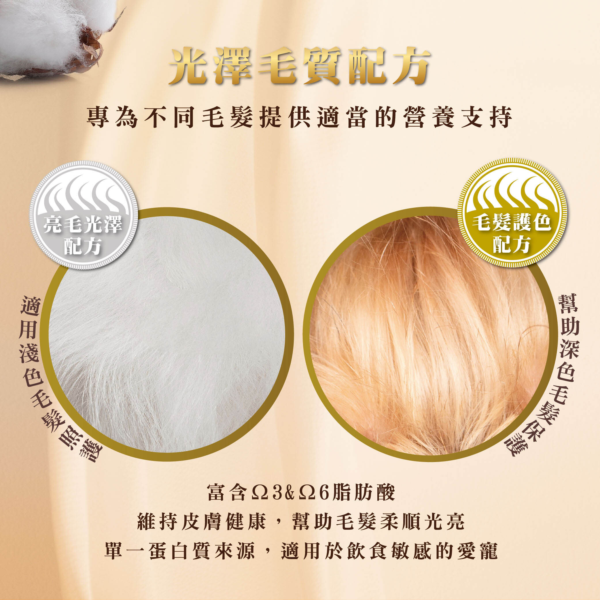 專為減少白色毛髮染色的風險而設計。配方採用單一動物蛋白質,具有高生物價值,酚丙氨酸和酪氨酸含量有限,銅含量有限,並含有Omega-3脂肪酸。