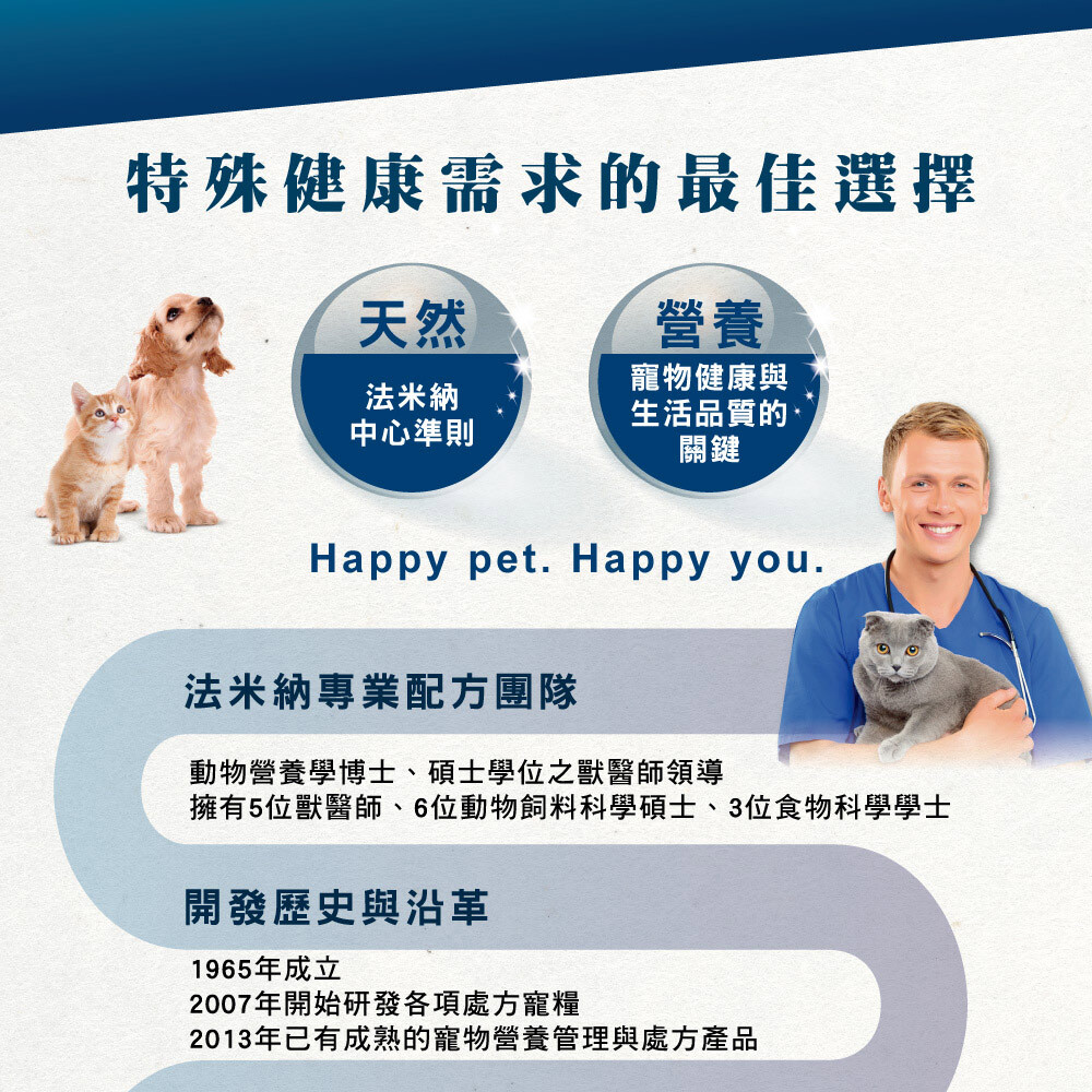 產品成分: 米、玉米筋質粉、脫水雞肉、雞脂肪、乾燥雞蛋、水解魚肉蛋白、氯化鉀、脫水魚肉、魚油、碳酸鈣、菊糖、果寡醣、甘露寡醣(萃取自酵母)、氯化鈉、葡萄糖胺(500mg/kg)。