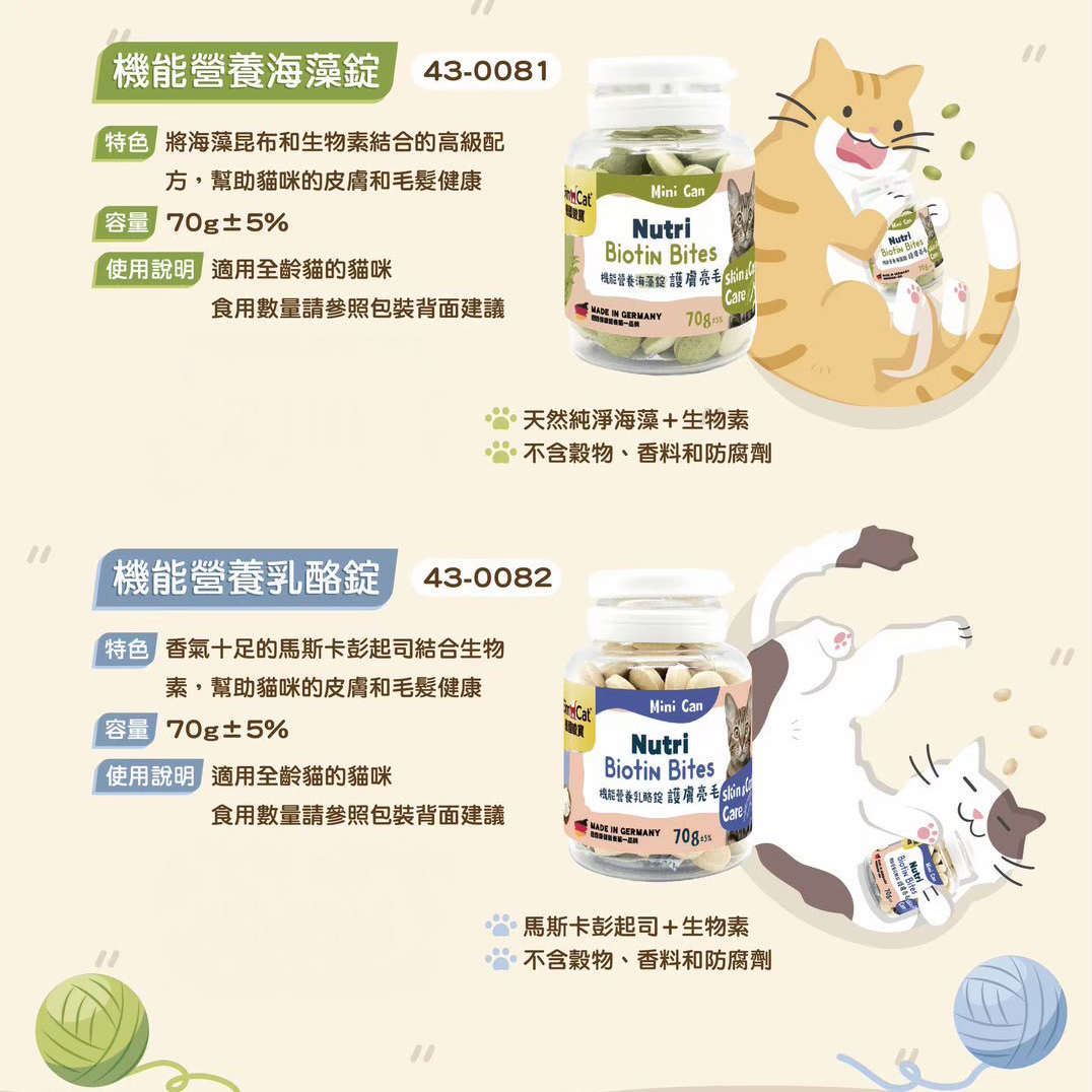 特性:將海藻昆布與生物素結合的高級配方,幫助貓咪的皮膚和毛髮健康。