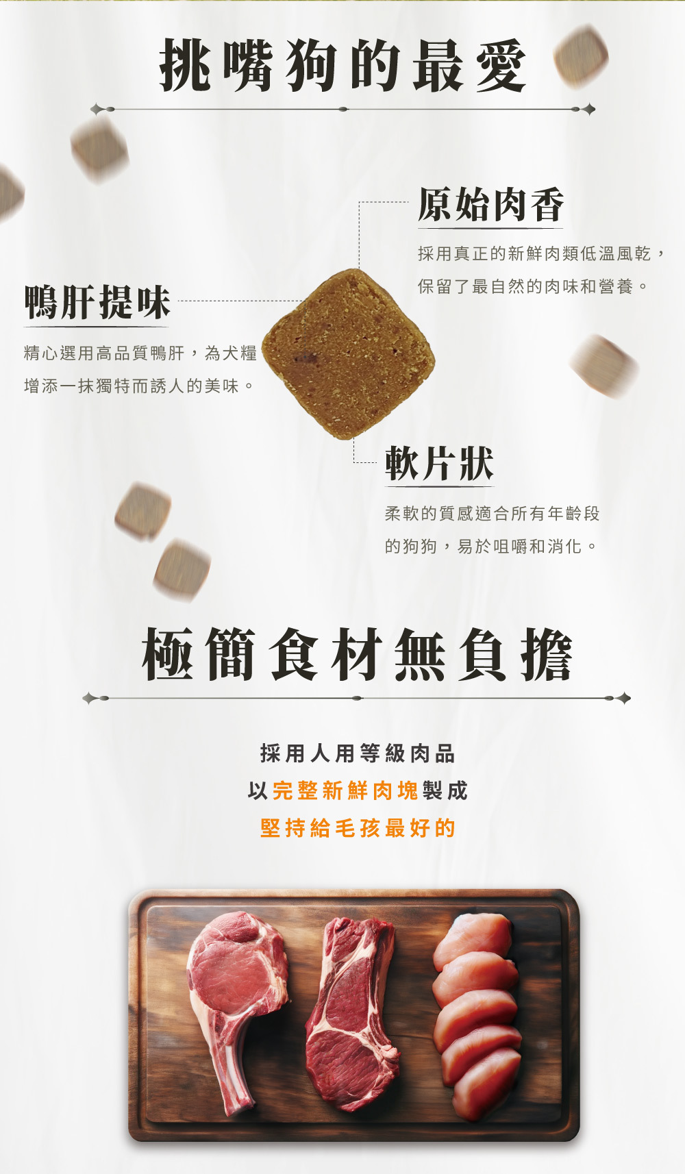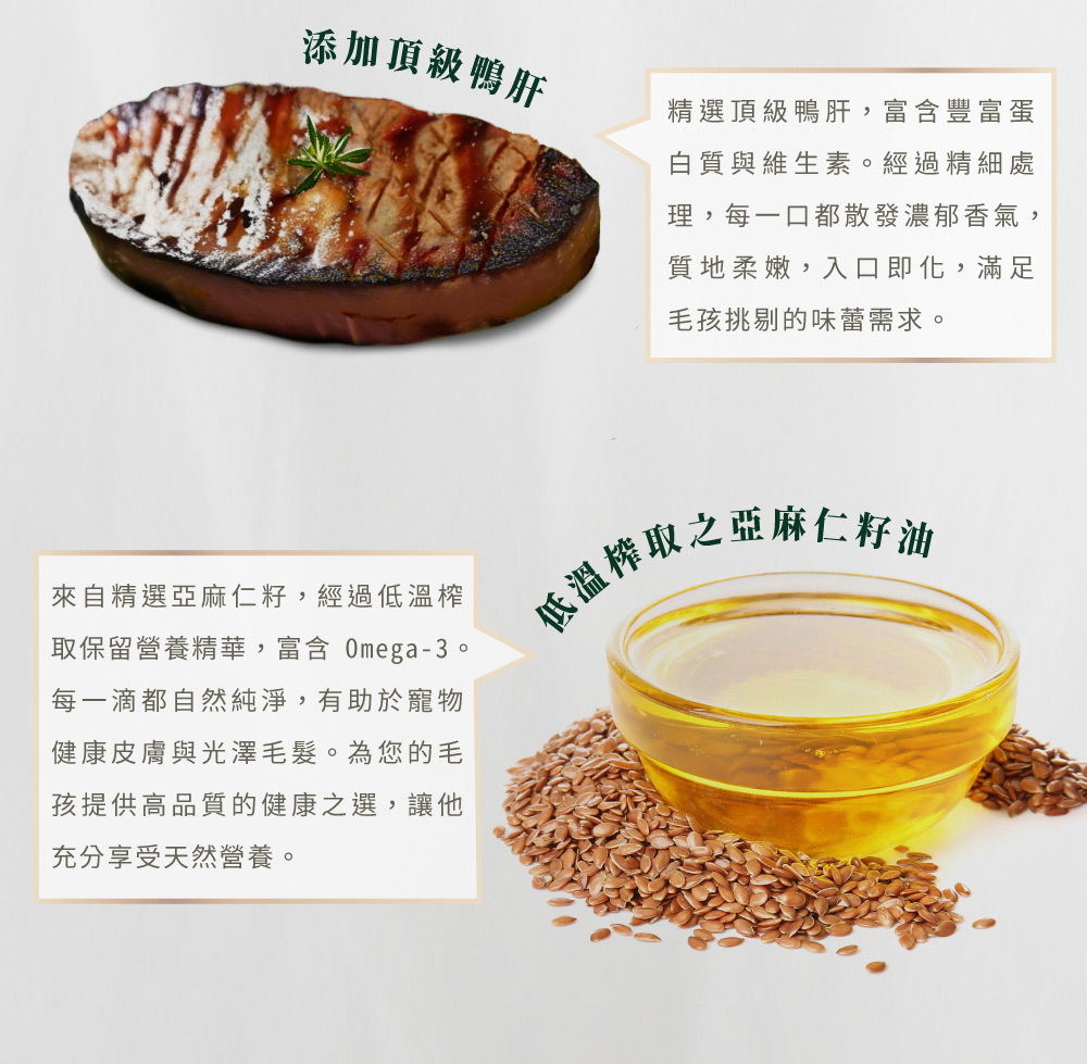 將食物過敏的因子降到最低,添加頂級鴨肝與低溫榨取的亞麻仁籽油