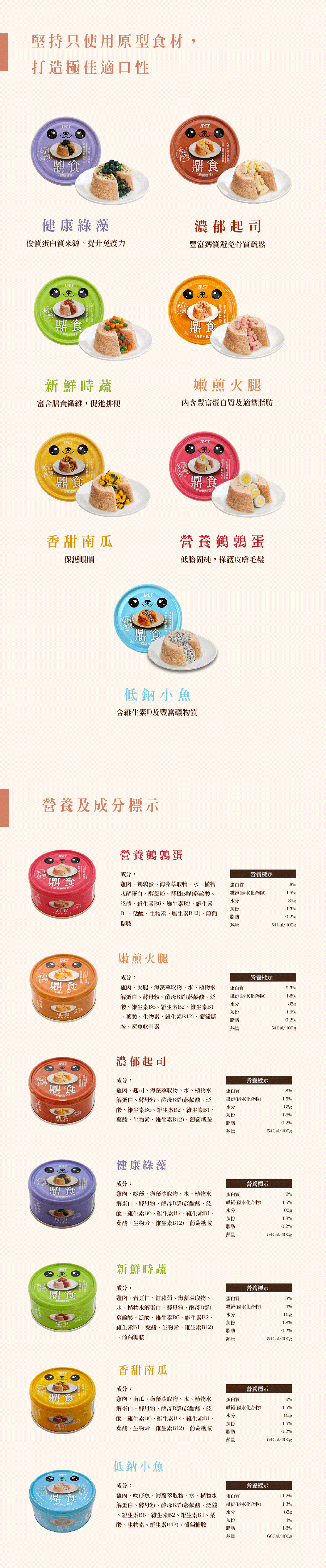 採用人用等級天然食材,保留食物原始風貌,全系列皆用本土安心雞肉,不含肉類副食品。