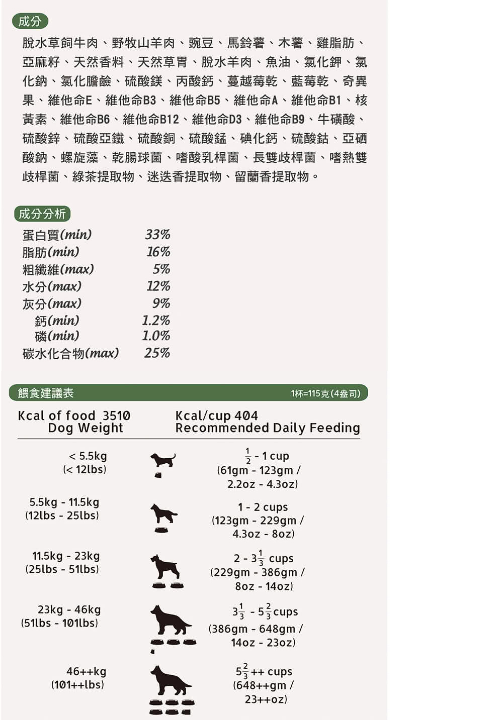 成分: 脫水草飼牛肉,野牧山羊肉,豌豆,馬鈴薯,木薯,雞脂肪,亞麻籽,天然香料,天然草胃,脫水羊肉,魚油,氯化鉀,氯化鈉,氯化膽鹼,硫酸鎂,丙酸鈣,蔓越莓乾,藍莓乾,奇異果,維他命E,維他命B3,維他命素B5,維他命A,維他命B1,核黃素,維他命B6,維他命B12,維他命D3,維他命B9,牛磺酸,硫酸鋅,硫酸亞鐵,硫酸銅,硫酸錳,碘化鈣,硫酸鈷,亞硒酸鈉,螺旋藻,乾腸球菌,嗜酸乳桿菌,長雙歧桿菌,嗜熱雙歧桿菌,綠茶提取物,留蘭香提取物,迷迭香提取物。