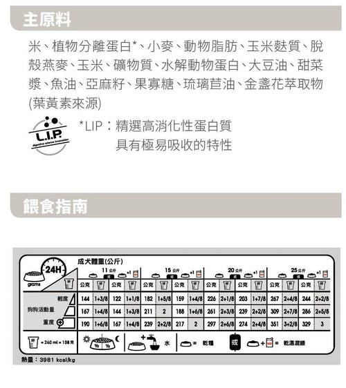 成分:米、植物分離蛋白*、小麥、動物脂肪、玉米麩質、脫殼燕麥、玉米、礦物質、水解動物蛋白、大豆油、甜菜漿、魚油、亞麻籽、果寡糖、琉璃苣油、金盞花萃取物(葉黃素來源) *LIP:精選高消化性蛋白質具有極易吸收的特性 營養成分分析: 蛋白質:24% - 脂肪:17% - 纖維素:1.4% - 灰份:5.9%
