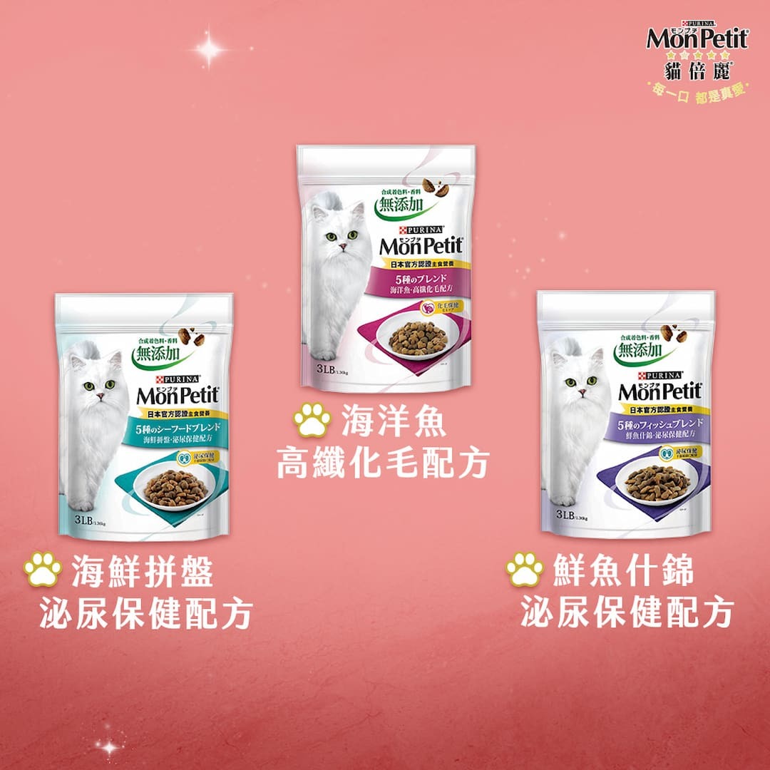 口味:成貓海洋魚高纖化毛、成貓海鮮拼盤泌尿保健、成貓鮮魚什錦泌尿保健