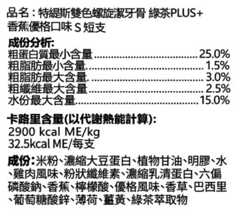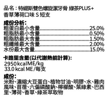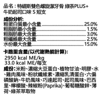 添加無咖啡因的綠茶萃取、薄荷及巴西里,幫助降低狗狗口中異味、清新口氣!