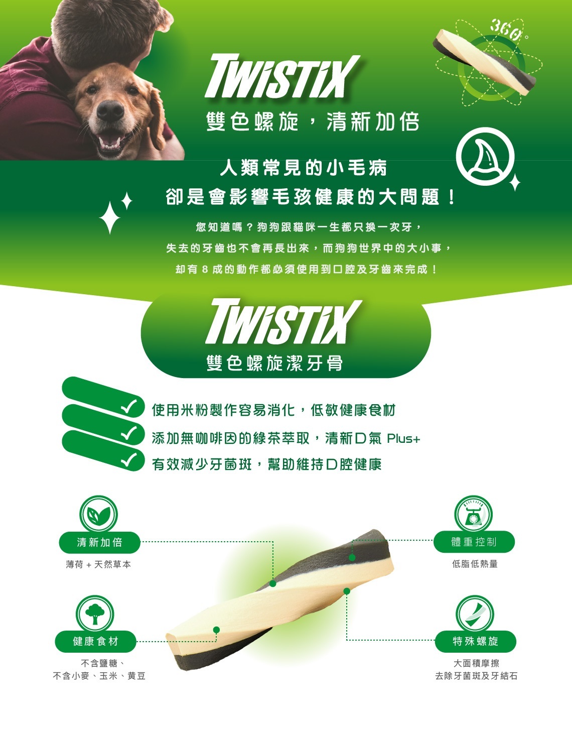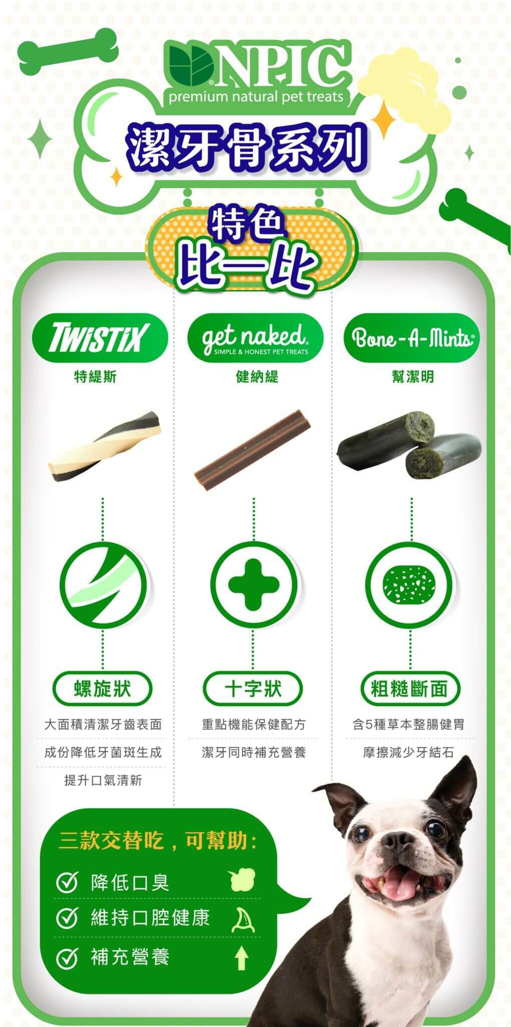 NPIC潔牙骨使用米粉製作,Twistix特緹斯擁有獨特360度螺旋角度,可大面積清除牙齒表面牙垢