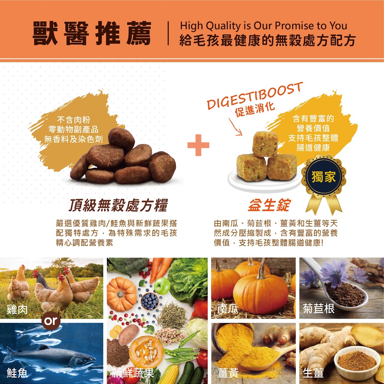 主成份:雞肉、雞肉粉、馬鈴薯蛋白、鷹嘴豆、豌豆、扁豆、雞脂、蔓越莓、天然香料、鮭魚油、碳酸鈣、曬乾磨碎芒草、木薯粉、亞麻籽、椰子油、氯化鉀、豌豆纖維、薑根、南瓜、薑黃、胡蘿蔔、蘋果、藍莓、西蘭花、冬南瓜、甘草根、薄荷、石榴、菠菜、豌豆蛋白、向日葵卵磷脂、DL-蛋氨酸、氯化膽鹼、牛磺酸、酵母萃取物、L-賴氨酸、丙酸鈣、維生素、礦物質、左旋肉鹼、葵花籽油、乾菊苣根、L-酪氨酸、濃縮乳清蛋白、絲蘭萃取物、芽孢桿菌、枯草桿菌、迷迭香萃取物。