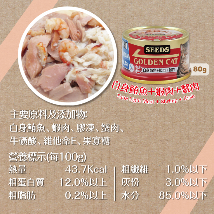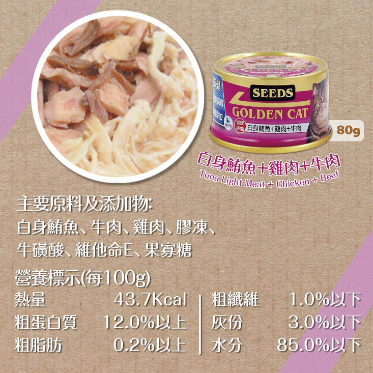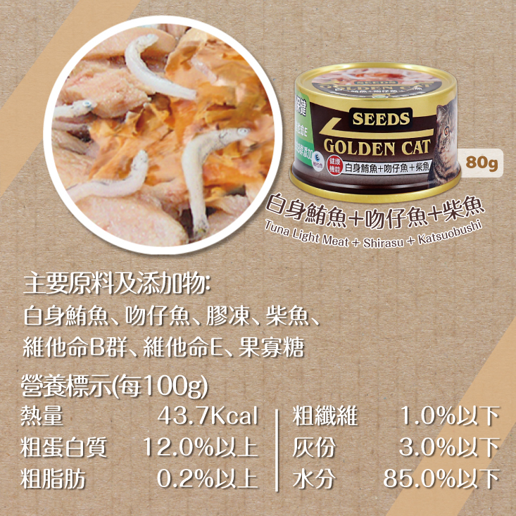 軟嫩優質的白身鮪魚,提供愛貓所需的蛋白質,每罐提供68g的水份,解決貓不愛喝水問題,添加機能配方,豐盛的內容是寵貓的最愛,有貓皆碑。