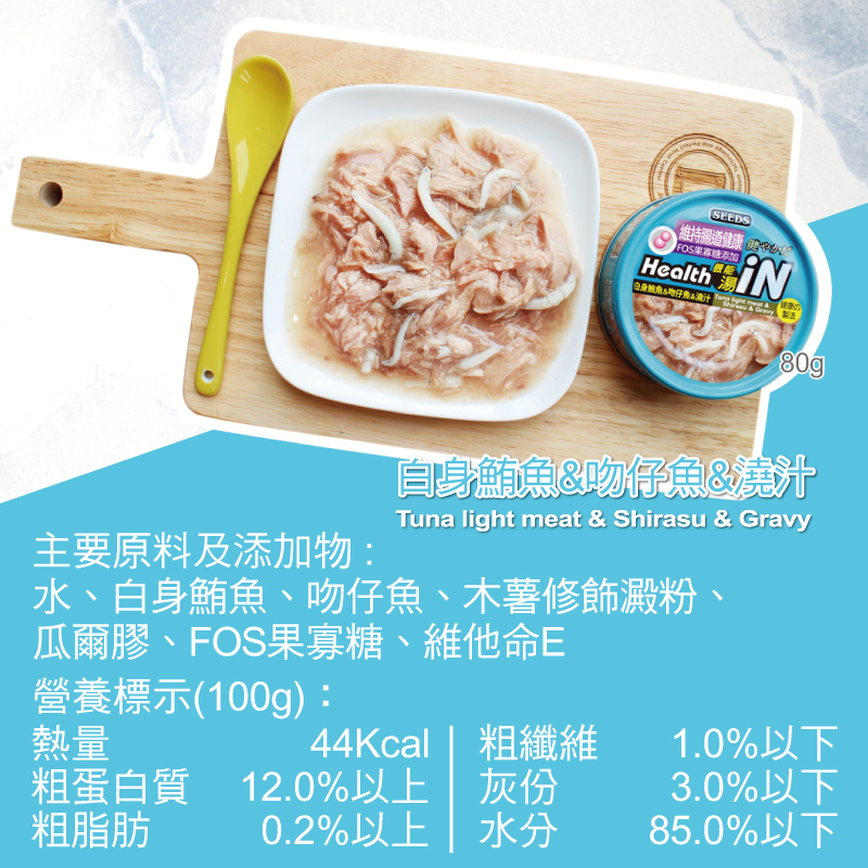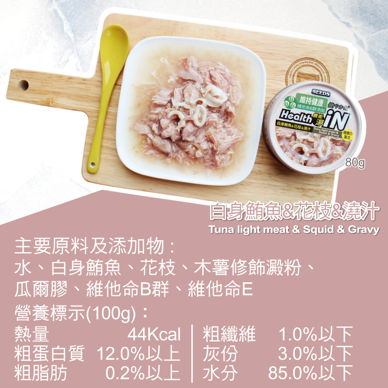 口味:鮪魚蝦肉湯汁、鮪魚花枝湯汁、鮪魚起司湯汁、鮪魚吻仔魚湯汁、鮪魚蟹肉湯汁(子貓離乳成長配方)、鮪魚雞肉湯汁(7歲中老貓重點強化配方)