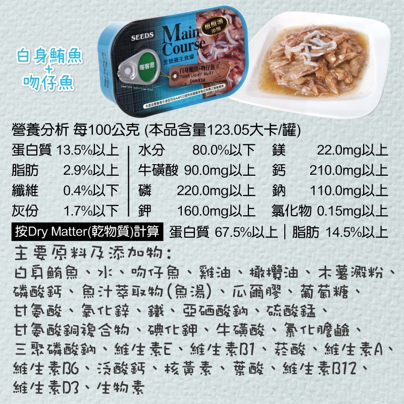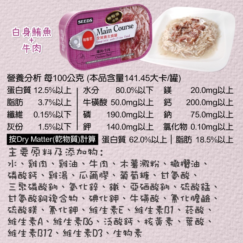 口味:100%純雞肉、雞肉+牛肉、雞肉+白身鮪魚、白身鮪魚+羊肉、白身鮪魚+吻仔魚