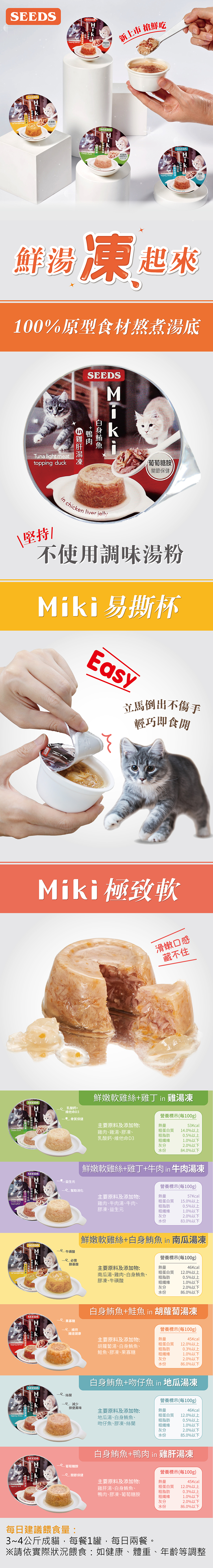 Mikiの 極致軟,滑嫩口感藏不住並保留魚、雞肉全營養,吃出原有食材的色香味。 採易撕杯封裝設計,立馬倒出不傷手,輕巧即食開,特別添加機能配方,值得愛貓細細品嚐。