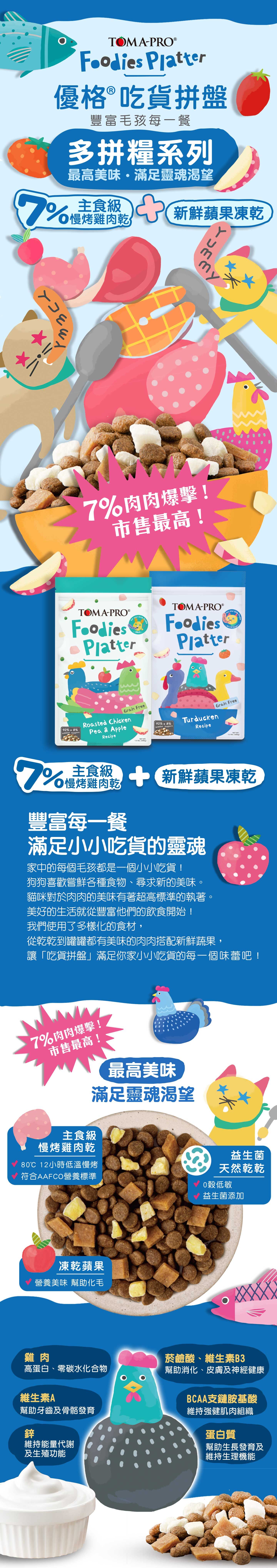 優格吃貨拼盤,加入慢烤雞肉乾佐料,符合AAFCO全價營養標準,添加蔬果凍乾,提供天然維生素及纖維幫助化毛。採用美加生產的WDJ等級乾糧,不含穀物、大豆、玉米及人工色素、香料等。