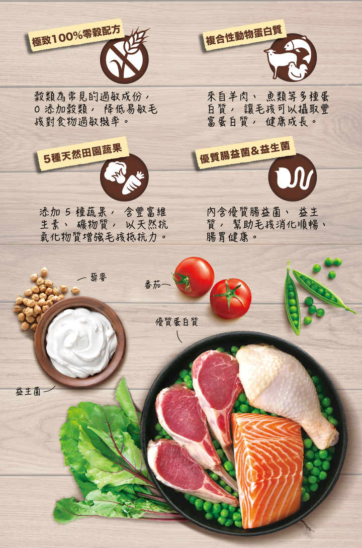 優格天然零穀食譜,100%不含致敏穀源,能降低毛孩食物過敏的機率。特別添加天然田園蔬果, 除了提供豐富的礦物質與維生素外,更有多種天然的抗氧化物質增強抵抗力,再搭配優質腸道益生菌,使天然蔬果中的纖維素和菊苣根中的果寡糖這些益生質發揮腸道保健、幫助消化的功用。優格零穀天然美味,粒粒健康粒粒香,讓寶貝快樂品嚐,簡單過生活。