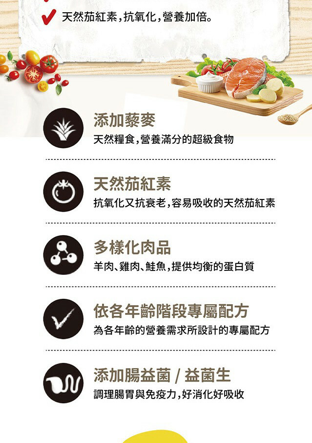 成分: 乾燥羊肉,乾燥雞肉,研磨糙米,研磨釀造米,玉米麩粉,研磨高梁,研磨玉米,雞脂(以混合生育酚保存)。乾燥甜菜根,天然調味料,乾燥鮭魚,鮭魚油,乾燥蕃茄粕,釀造乾燥酵母,乾燥雞蛋。研磨亞麻仁,氯化鉀,藜麥,食鹽,維生素(維生素E,菸鹼酸(維生素B3)、硫胺素(維生素B1)、泛酸鈣(維生素B5)、維生素A,鹽酸吡哆醇(維生素B6)、維生素B2、維生素D3、維生素B12、葉酸、生物素),乾燥番茄,礦物質 (硫酸锌、硫酸鐵、硫酸銅、氧化錳、亞硒酸钠、碘酸鈣),乾燥菊苣根(菊苣多醣、果寡糖來源),氯化膽鹼,鮭魚油(以混合生育酚保存), DL-甲硫氨酸,絲蘭萃取精華,L-抗壞血酸-2-聚磷酸鹽(維生素C活性來源),啤酒酵母萃取物。益生菌(腸球菌,嗜酸乳桿菌,黑麴菌,長枝木徽菌,枯草芽孢桿菌)。