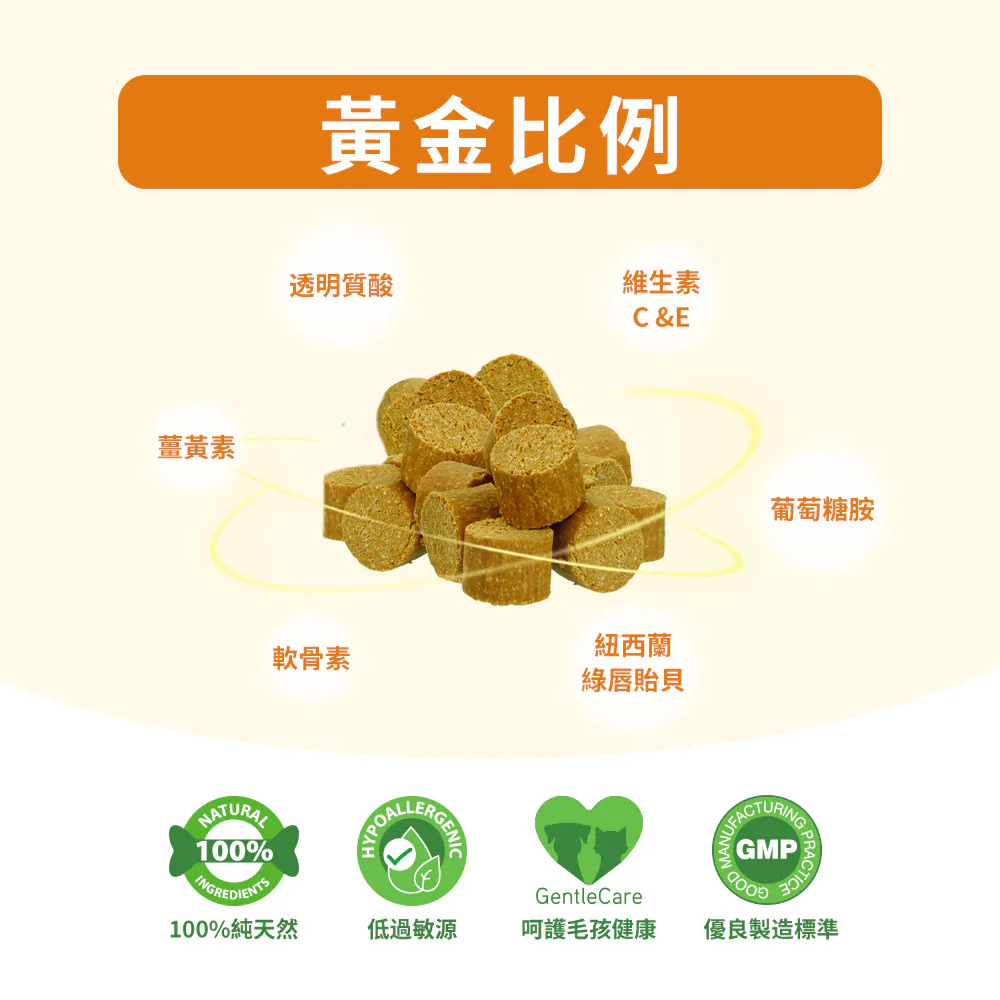 ◆額外添加玻尿酸、薑黃素、紐西蘭綠唇貽貝、維他命C、E及錳等成分。