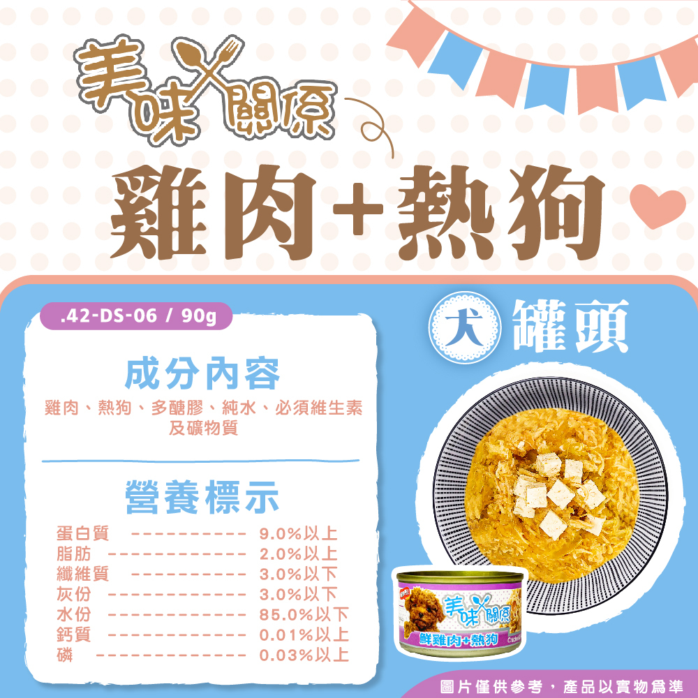 新鮮嫩雞肉添加鮮嫩熱狗,新鮮可口,讓愛犬健康充沛有活力,提供愛犬成長所需的均衡營養,健康滿點。
